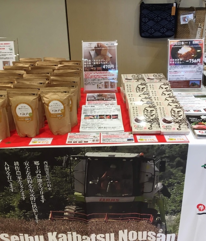 4月29日から5月4日まで銀座にある岩手県のアンテナショップ「いわて銀河プラザ」においてせいぶ農産フェアを実施しました。今回、きたかみ牛すじカレー、きたかみ牛ハンバーグ、小麦粉を販売しました。試食は弊社で生産したひとめぼれを使って炊き上げたごはんにきたかみ牛すじカレーをかけてカレーライスにして出しました。試食は出すとあっという間になくなるくらいで大好評!箱のデザインに北上の鬼剣舞のイラストも概ね好意的に受け取られていました。また、お米のおいしさを言ってくれる人も多かったのでうれしかったです。ハンバーグのなかに北上特産のアスパラ入りであることや小麦粉のグルテン質がよくパン屋さんに好評であることなど店内の一等地を借りたイベントなのでたくさんの人に知っていただけたことはよかったと思います。こういうものがあったらいいのにという声も聞けたので今後の参考になりました。また、同じ期間に田野畑村から山地酪農牛乳、遠野味噌醤油から漬物・野菜の販売があり、お客様への声の掛け方、試食のさせ方など勉強になりました。いわて銀河プラザには様々な人が訪れます。観光客や銀ブラ客だけではなく、マスコミ、外食企業やホテルのコックさんなど多彩です。ここに定期的なイベントを行うことはいろいろな意味で価値があると感じた6日間でした。