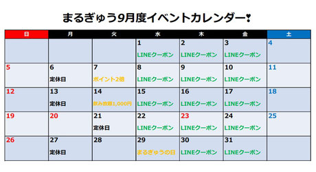2021/09/02 9月イベントのお知らせです! まるぎゅう今月のイベントのお知らせです! 7日(火)、ポイント2倍デー 14日(火)1,000円飲み放題(@ ̄□ ̄@;)!! 29日(水)まるぎゅうの日(今月は、まるぎゅう盛り通常価格4,890円→4,300円❕) その他、LINEクーポンも随時発行してまいります! イベント時にはあらためましてお知らせしますので、ぜひとも、まるぎゅうにお越しくださいませ(^^♪ tagPlaceholderカテゴリ:
