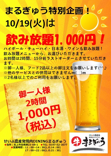 2021/10/19 1,000円飲み放題の日です! 本日は、まるぎゅうの特別企画、飲み放題1,000円(税込)の日です(^^♪ ハイボール・チューハイ・日本酒・ワインも飲み放題! 飲み放題メニューから、お選びいただきます。 皆様のご来店を心からお待ちしております(^^♪ tagPlaceholderカテゴリ: