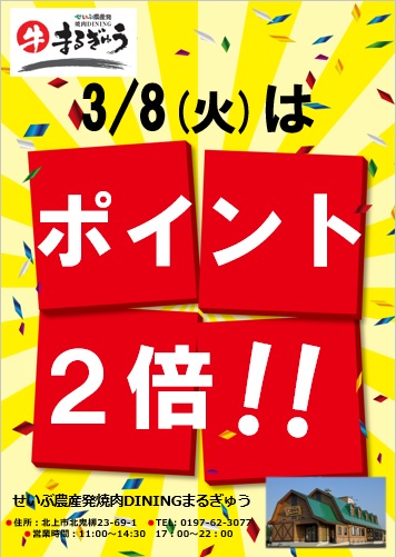 2022/03/08 ポイント2倍デーです! 本日は、まるぎゅうポイント2倍デーです‼ 店内飲食はもちろんですが、精肉販売やテイクアウト、野菜販売等すべてポイント2倍対象とさせていただきます!! 皆様のご来店を、心よりお待ちしております(^^♪ tagPlaceholderカテゴリ: