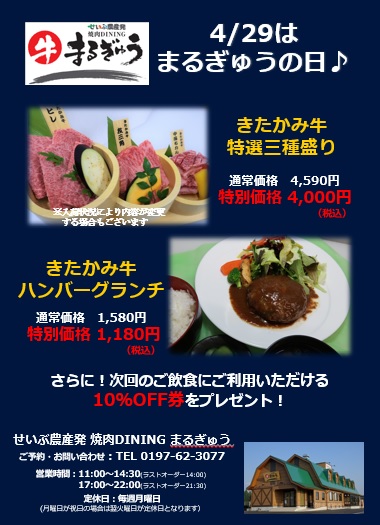2022/04/29 まるぎゅうの日です‼ 本日4月29日は、まるぎゅうの日です‼ 今月のまるぎゅうの日は、ランチメニューのきたかみ牛ハンバーグランチ1,580円が、特別価格1,180円(税込)、グランドメニューのきたかみ牛特選三種盛り4,590円が特別価格4,000円(税込)になるんです (@ ̄□ ̄@;)!! さらに、次回ご来店(飲食)にご使用いただける10%off券をプレゼントしちゃいます‼ 皆様のご来店を、心よりお待ちしております(^^♪ tagPlaceholderカテゴリ: