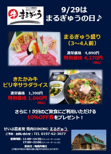 2022/09/29 まるぎゅうの日です‼ 本日9月29日(木)は、まるぎゅうの日です‼ 今月のまるぎゅうの日は、ランチメニューのきたかみ牛ピリ辛サラダライス1,390円が、特別価格1,060円(税込)、グランドメニューのまるぎゅう盛り4,890円が特別価格4,270円(税込)になるんです (@ ̄□ ̄@;)!! さらに、次回ご来店(飲食)にご使用いただける10%off券をプレゼントしちゃいます‼ 皆様のご来店を、心よりお待ちしております(^^♪ tagPlaceholderカテゴリ: